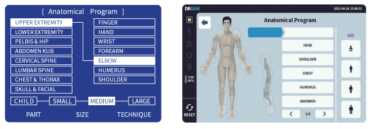 The GXR-E40S PLUS is equipped with DRGEM’s intuitive APR (Anatomic Programming Radiography) software, available in both text and graphical formats. This user-centric interface streamlines image acquisition by allowing operators to select predefined parameters based on body parts and patient type. Combined with its 1,280 programmable user settings, the system empowers radiologists and technicians to work efficiently and with confidence.